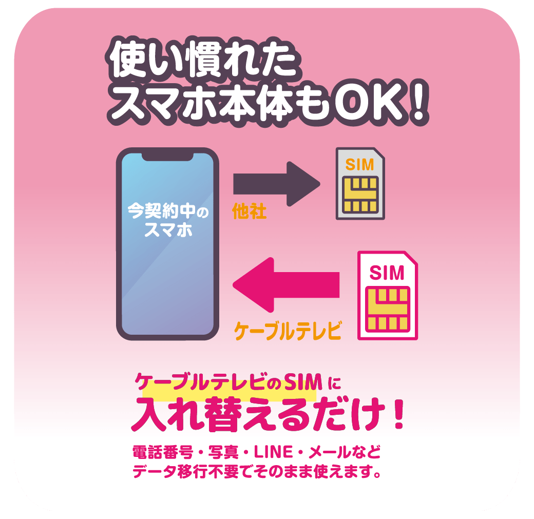 お使いのスマホのSIMカードを差し替えるだけでOK!写真や電話帳の移行などの面倒な作業は一切なし。どなたでも簡単にお使いただけます。