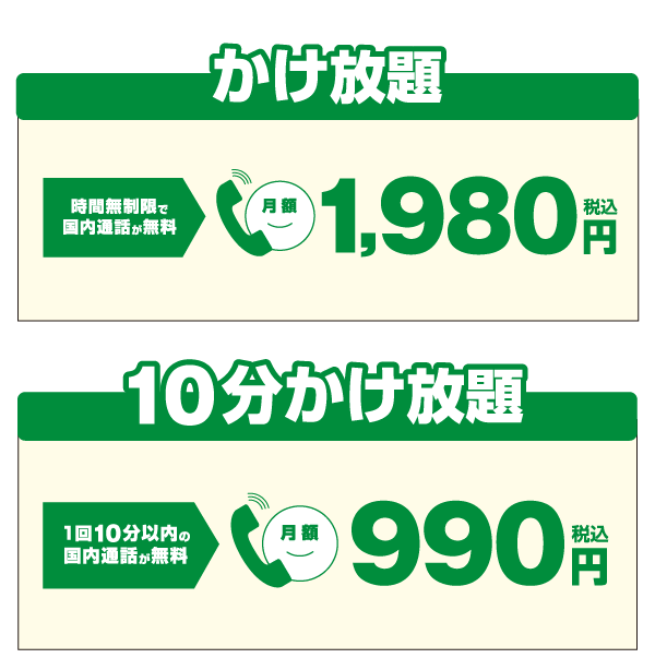 ※フリーダイヤル・ナビダイヤル(0570) ・110番等の3桁番号・国際電話・転送電話・テレビ電話 ・ 衛星電話・特定の電話番号への発信は対象外です。 ※通話定額オプションは、お申し込み後キャンセルができません。 ※新規で通話定額オプションをお申し込みされたお客様は、お申し込みされた日からご利用いただけます。 利用中の通話定額オプションを変更されたお客様は、お申し込みした翌月1日よりご利用いただけます。 ※通話定額オプションの利用料金は利用開始月から満額発生します。※通話定額オプションを解約される場合、解約申し込み日にかかわらず月末解約となり、 料金は満額発生します。 ※一般的な利用を逸脱したものと想定される通話 (長時間にわたる通話等) は、 当社の判断のもとに切断する場合があります。